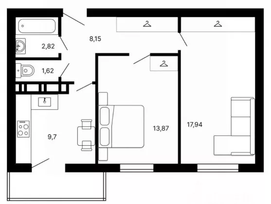 Площадь квартиры: 55 кв.м. с учетом балкона с коэф. 0,3. Гостинная 17,9 кв.м., спальня 13,8 кв.м., кухня 9,6 кв.м., коридор 8,1 кв.м. ванная 2,8 кв.м. туалет 1,6 кв.м., балкон 3,6 не застекляемый!