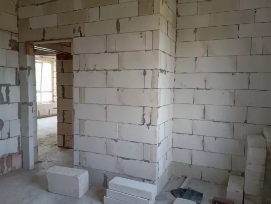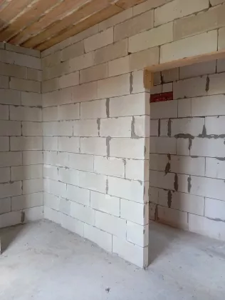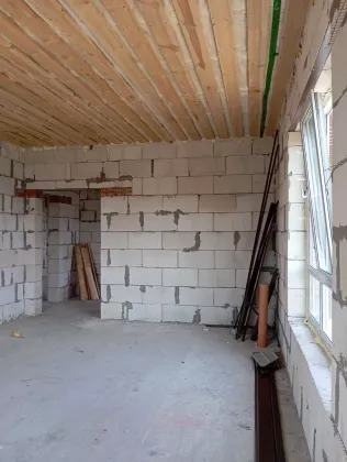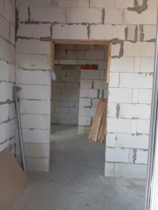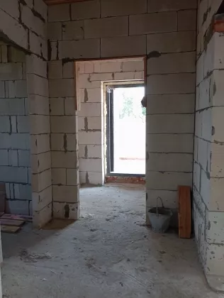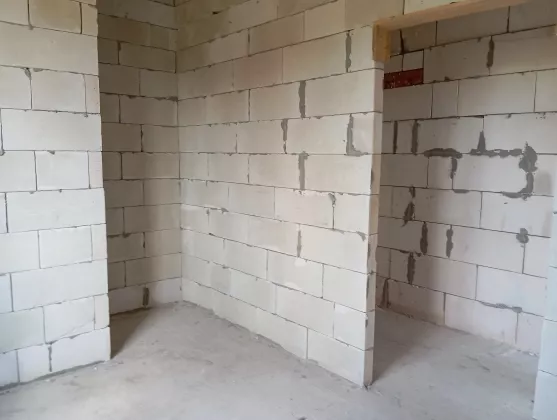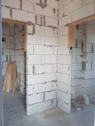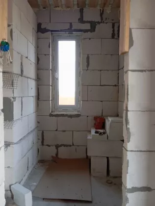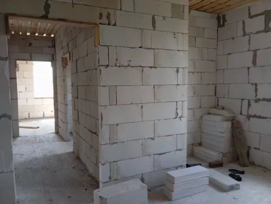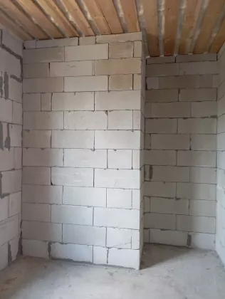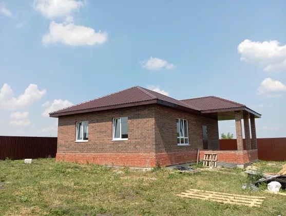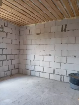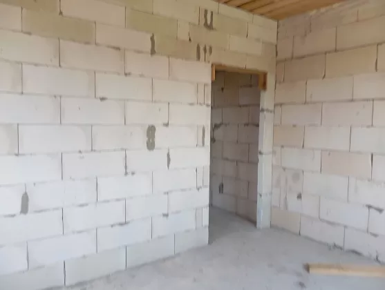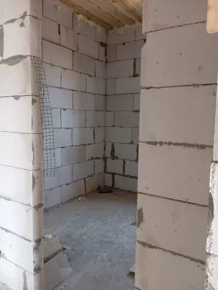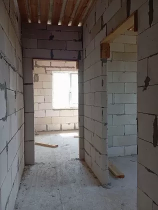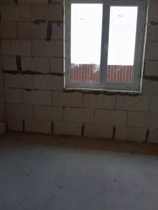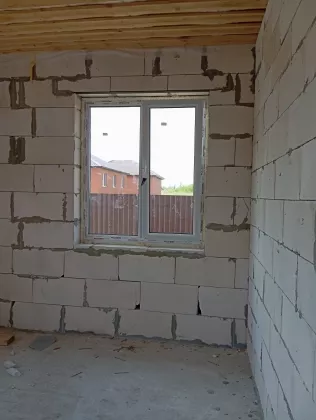 Черновая отделка: буронабивной фундамент с монолитным ростверком, материал стен пеноблок 250х300, фасад облицовочный кирпич. Полы засыпаны песком и залиты бетонной смесью. Установлены пластиковые окна 70 профиль, с двойным стеклопакетом и отражающей пленкой. Крыша перекрыта металлочерепицей, дышащий материал, утеплена, входная металлическая дверь с теромразрывом. По всему периметру установлен забор, с воротами и входной дверью. Продается в таком варианте, кака на представлено на фото.