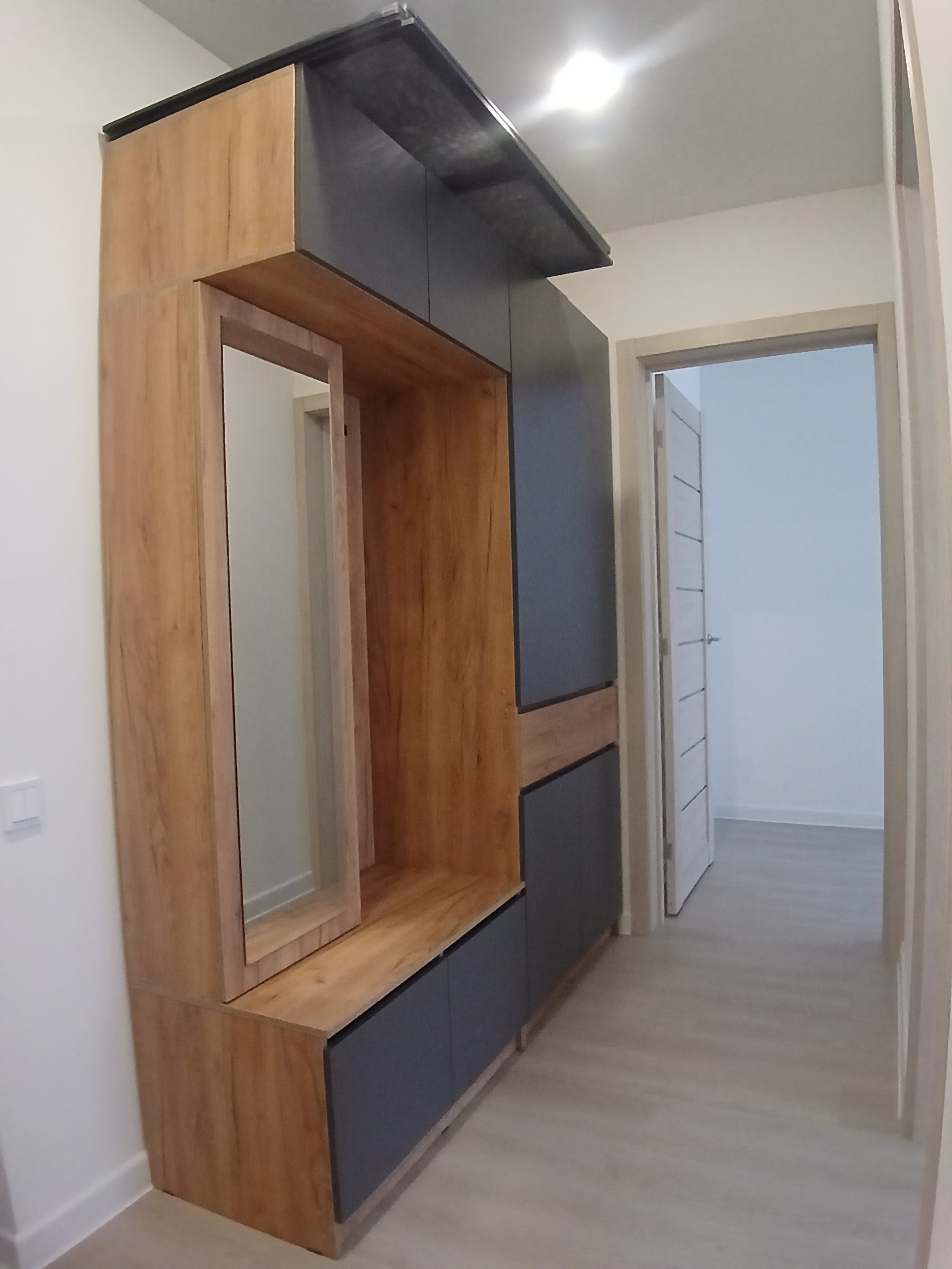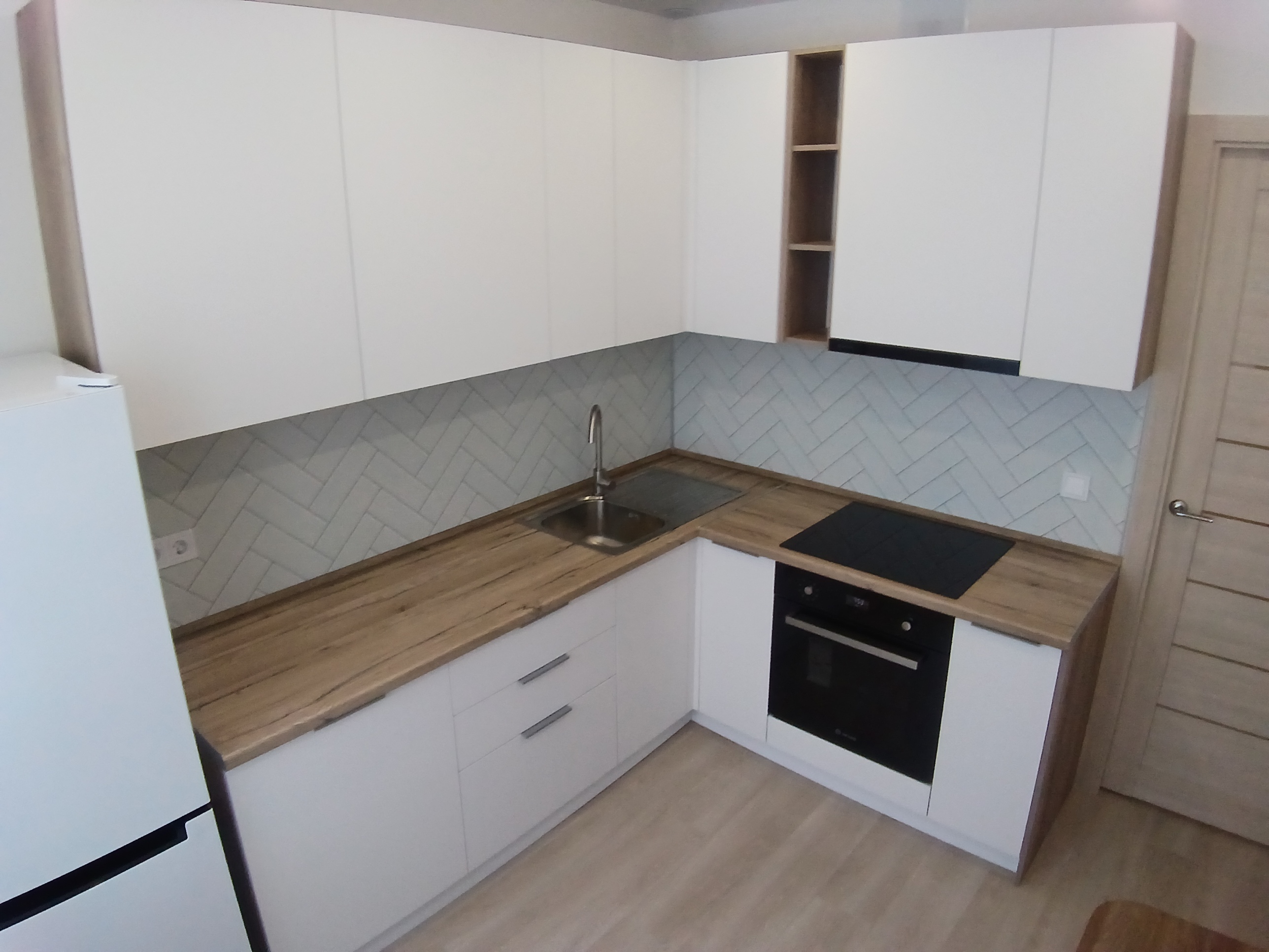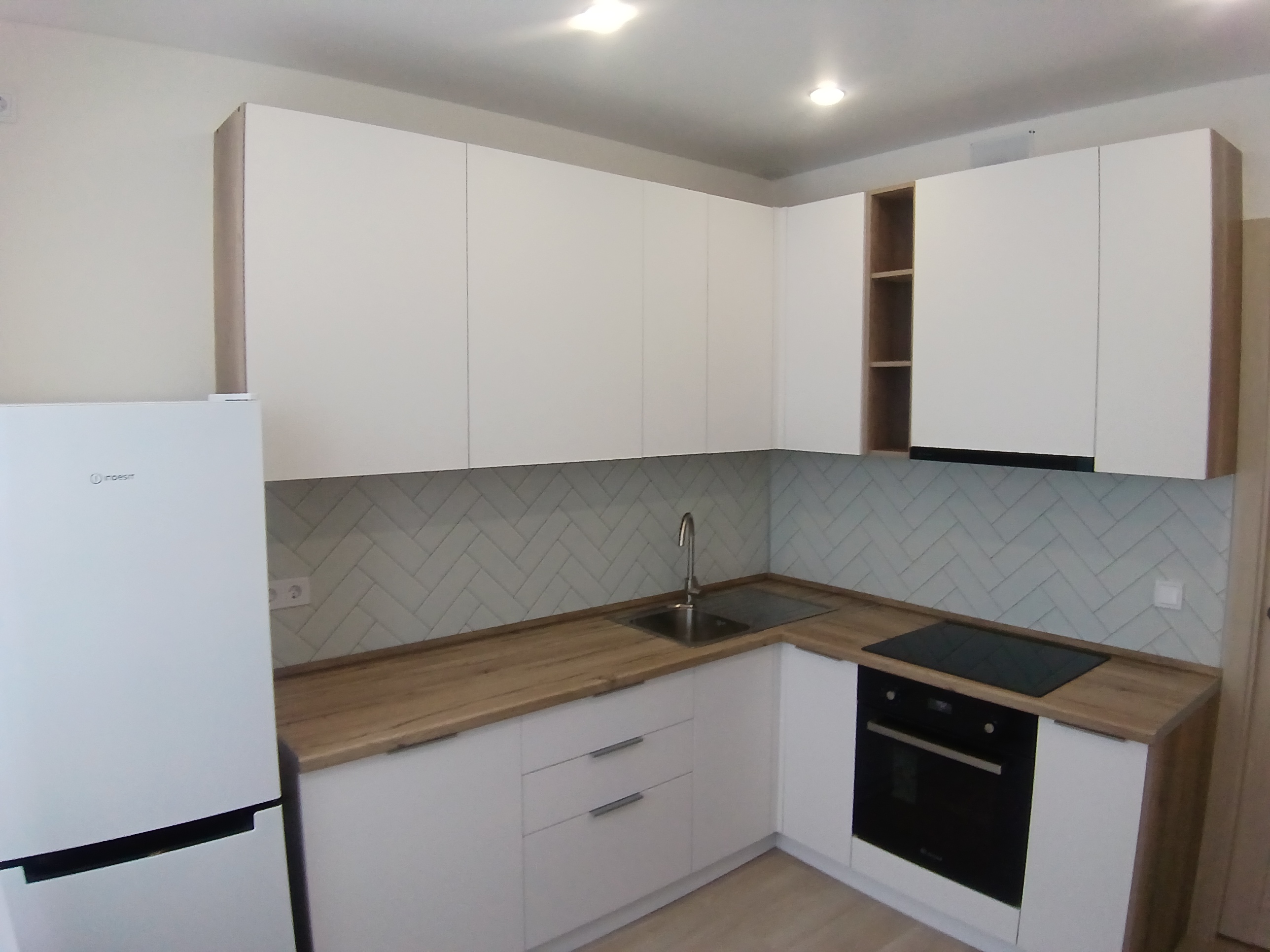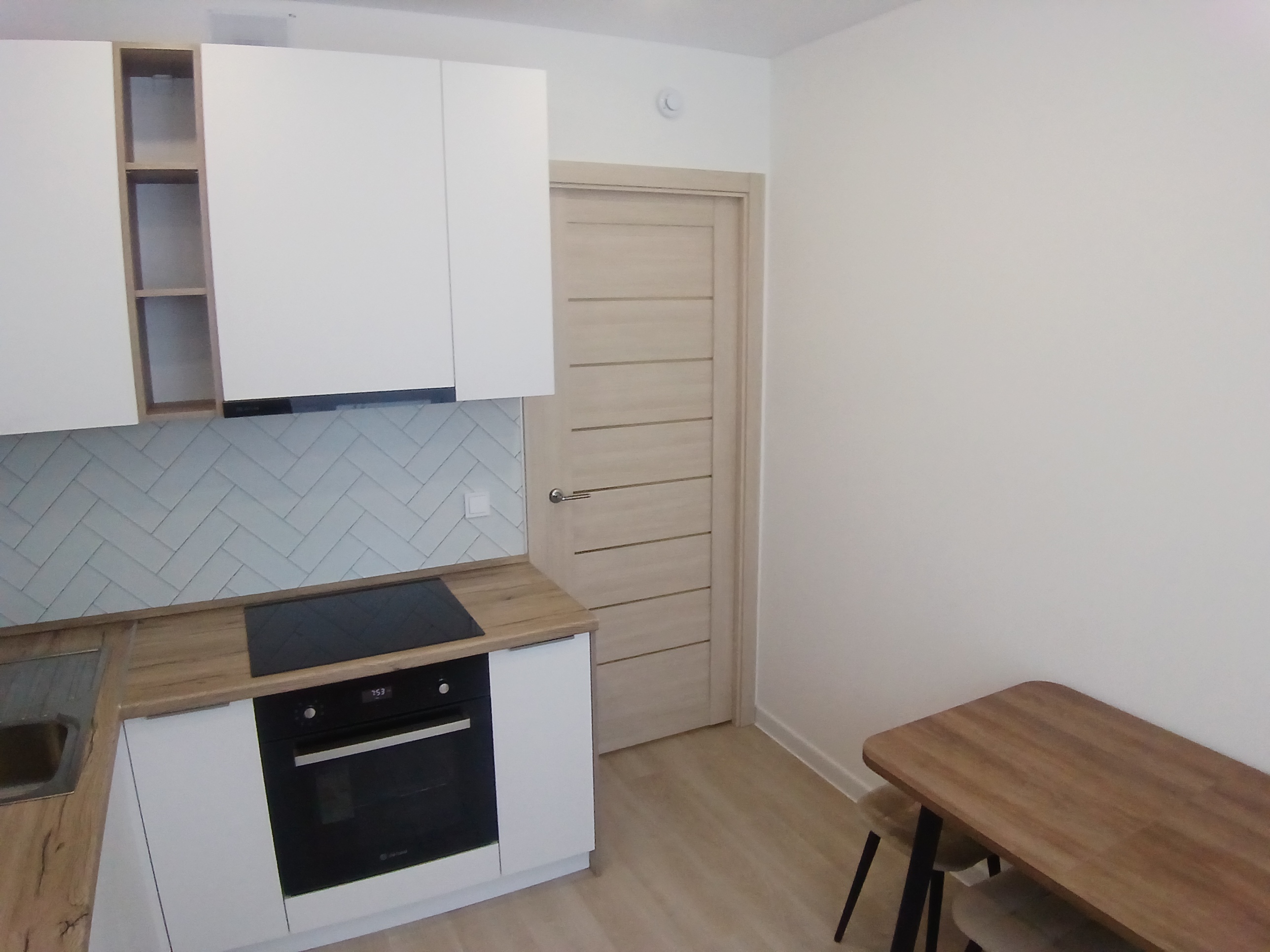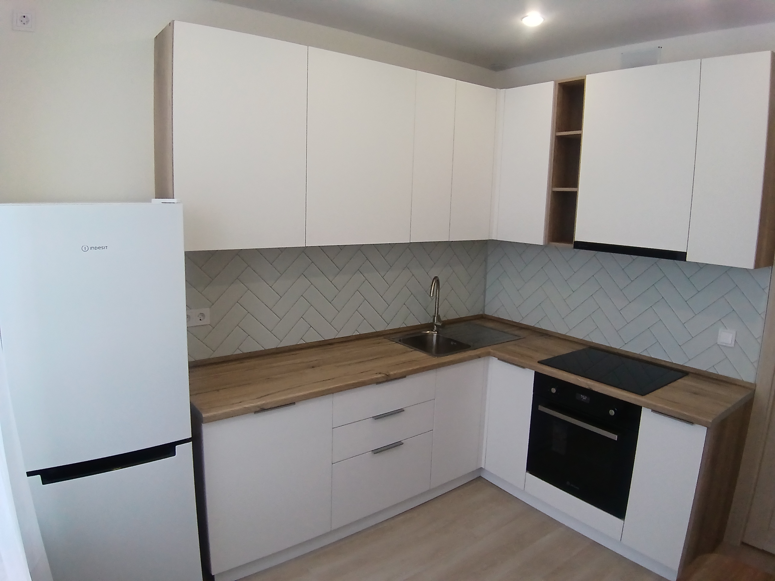 Кухонный гарнитур, стол, стулья, варочная панель, духовой шкаф, вытяжка, холодильник, стиральная машина, два раскладных дивана, шкаф в спальне и прихожей.