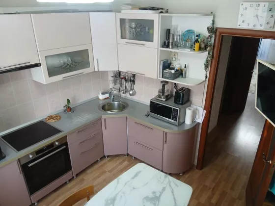 Отделка квартиры: в квартире выполнен ремонт, обои, ламинат, натяжные потолки , разводка электричества по квартире, пластиковые окна, аллюминивые радиаторы отопления, сантехника, установлен водонагреватель, установка приборов учета воды, электричества, лоджия утеплена и застеклена, межкомнатные двери, входная металлическая дверь.