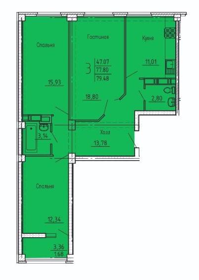 Плoщaдь квapтиpы без учёта лоджии: 77 кв.м